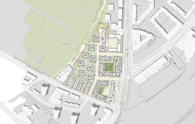 Entwicklung eines realisierbaren Planungskonzepts für ein qualitativ hochwertiges, mischgenutztes, urbanes Stadtquartier mit unterschiedlichen Wohnnutzungen, einem Nachbarschaftshaus mit Kindertagesstätte, sowie einer Einrichtung zur Betreuung von alleinstehenden Männern und einer Pflegeakademie . Das neue Quartier ist intensiv durchgrünt, und mit dem westlich angrenzenden Pragfriedhof verzahnt.