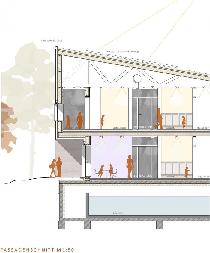 Der zweigeschossige Holzbau steht einem massiven Untergeschoss, das neben den Nebenräumen auch eine Eisspeicherheizung aufnimmt. In Kombination mit der thermischen Solaranlage und den PV-Elementen auf dem nach Süden ausgerichteten Pultdach ist die Realisierung eine Plus-Energiegebäudes möglich.